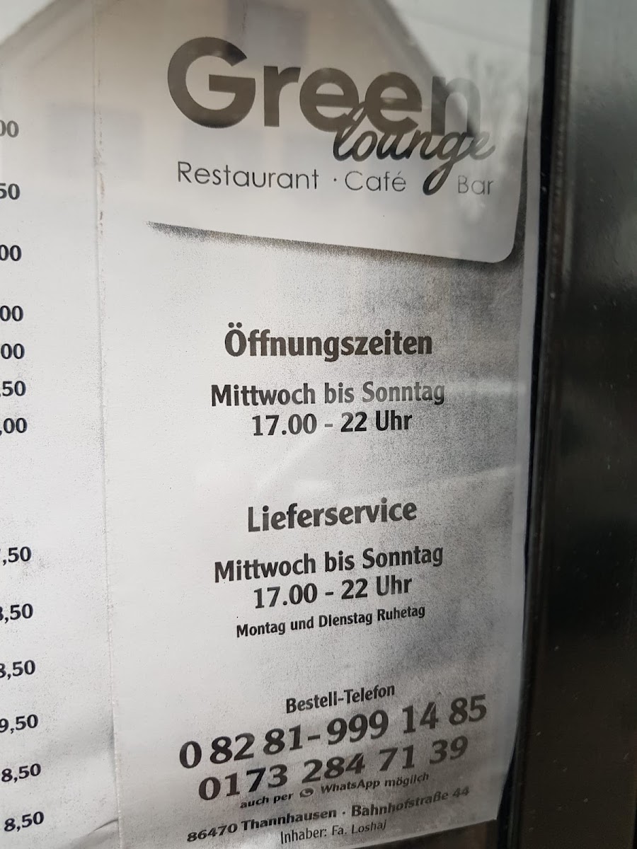 Welcome to Green Lounge, a charming restaurant and bar located at Bahnhofstraße 44 in Thannhausen, Germany. Known for its delightful pizza delivery, this eatery has quickly become a local favorite.